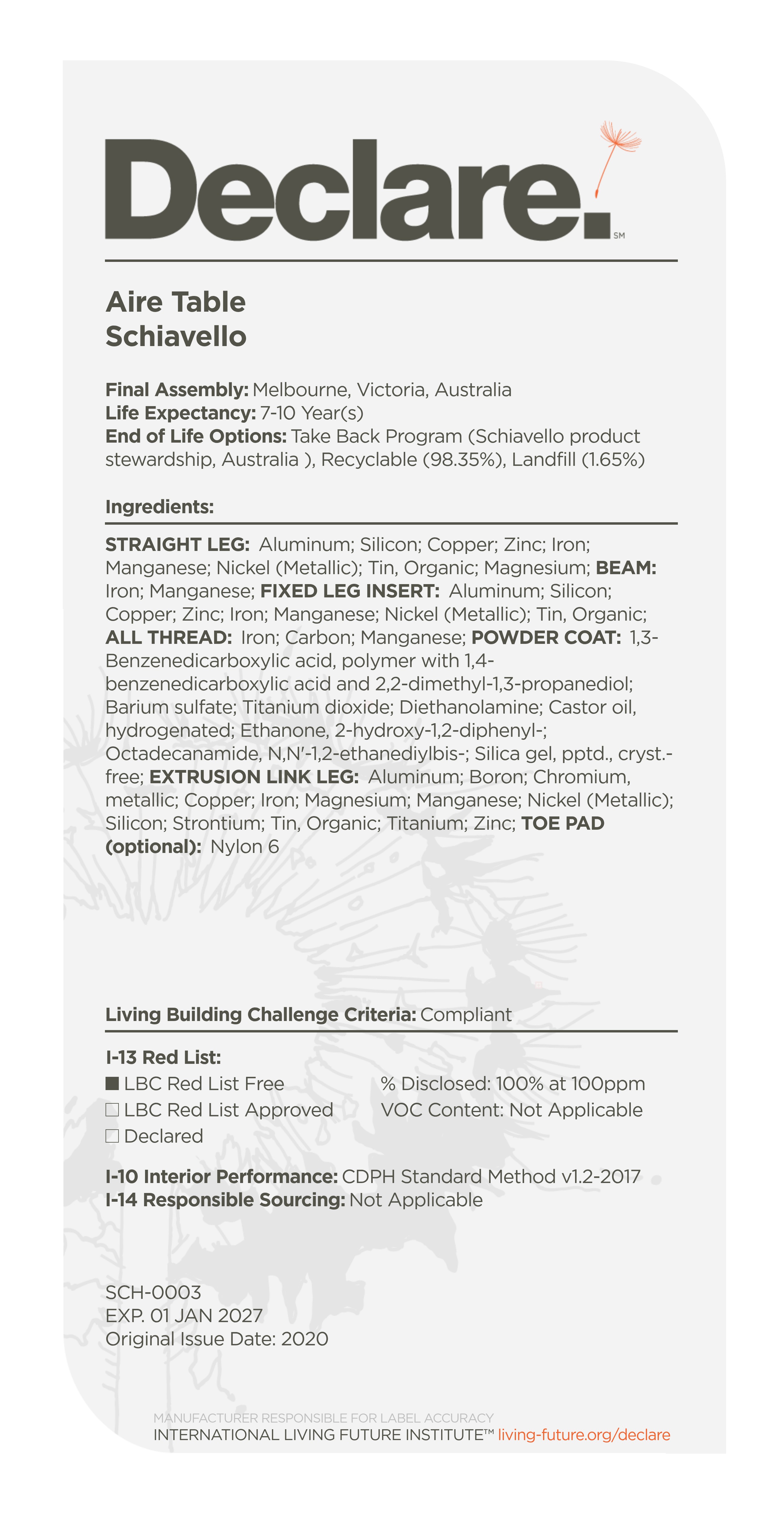 Aire aluminium legs and steel understructure can be powder coated in a variety of tones, sourced from the Schiavello ColourLab palette. Tabletops are available in a soft-edged radius and the veneer worktops can be finished in an Oak or coloured wash.