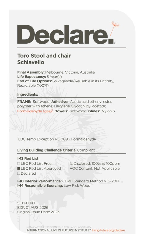Toro’s frame is made from solid Oak—a low embodied energy and a renewable resource, produced using water-based stains and sealers, low VOC finishes and wood harvested from sustainably managed forests.
