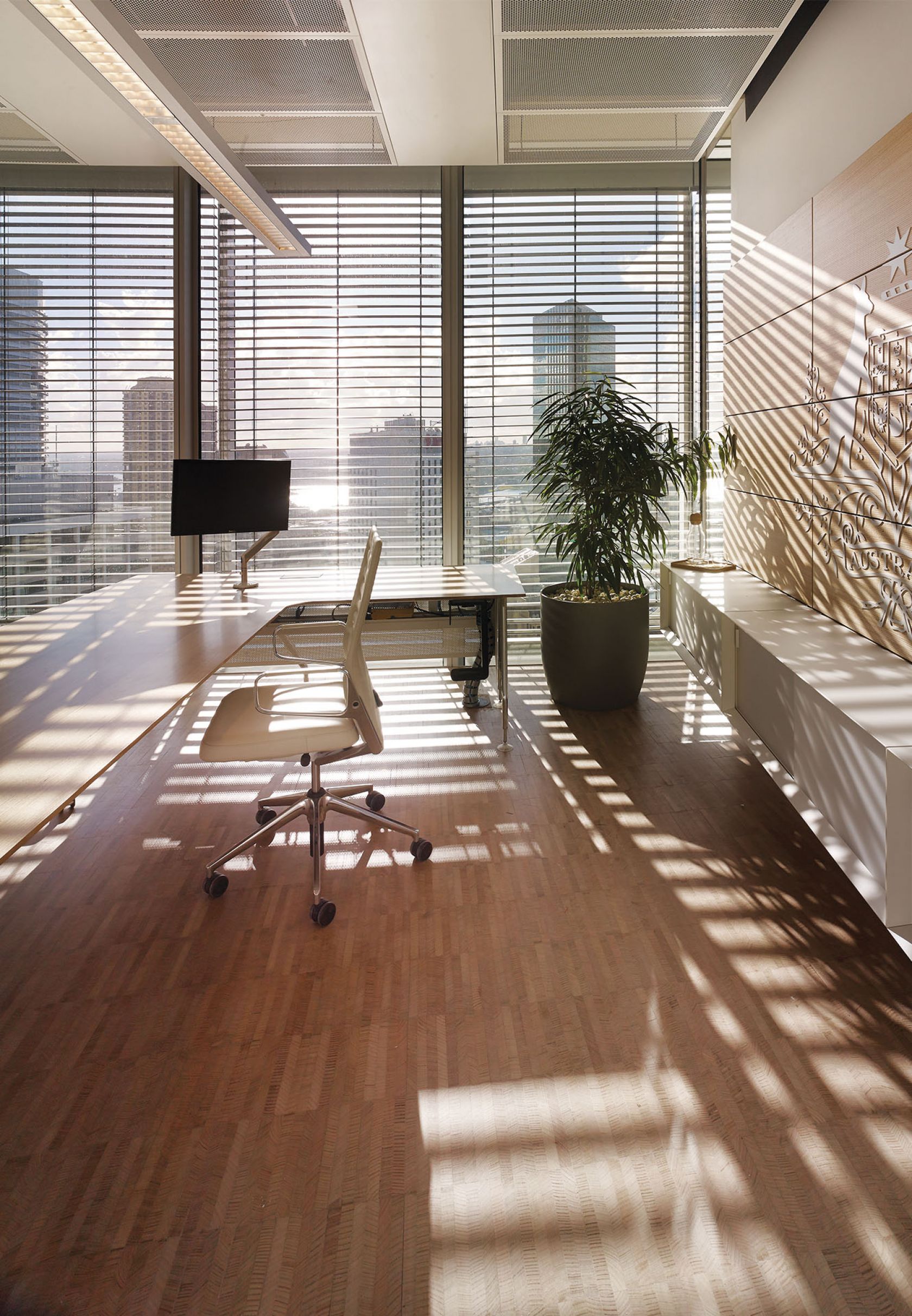 For Schiavello, the project afforded the opportunity to showcase the company’s deep set of capabilities, from construction to in-house design, engineering and furniture manufacturing. When the team ran into a critical timing challenge securing the architecturally-designed metal pendant lighting required for two conference rooms, Schiavello’s metal fabrication division stepped in as the manufacturer. Schiavello also harnessed joinery expertise to deliver some of the most highly crafted items of furniture, such as the main conference room table. Meanwhile, Schiavello Signage developed a detailed laser-cut metallic Australian crest designed by Architectus – one of the key focal points in the fitout.